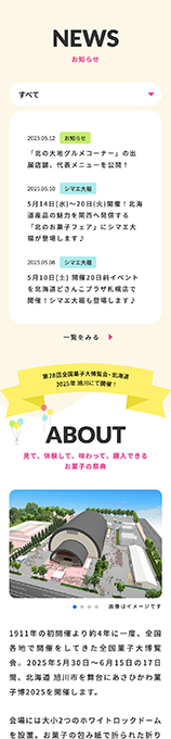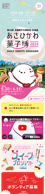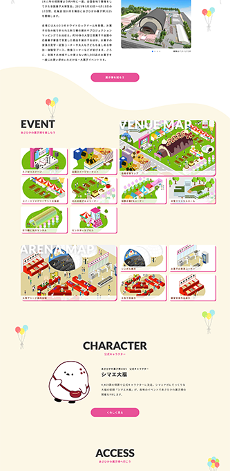 イベントのマスコットキャラクターである『シマエ大福』をユーザーに強く印象付けるため、サイト内のさまざまな箇所にキャラクターを登場させています。メインビジュアルやCTAボタンの近く、フッターなどにもキャラクターを配置し、親しみやすい雰囲気を作りながらイベントの認知度を高める工夫をしました。