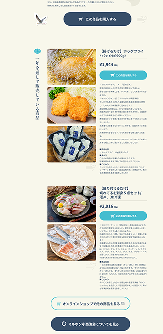 「パンフレットと連動しつつ、情報をさらに深堀りする」ことを意識して制作、漁の様子や商品がどのようにして作られているのかを視覚的に説明し、信頼感を高めています。